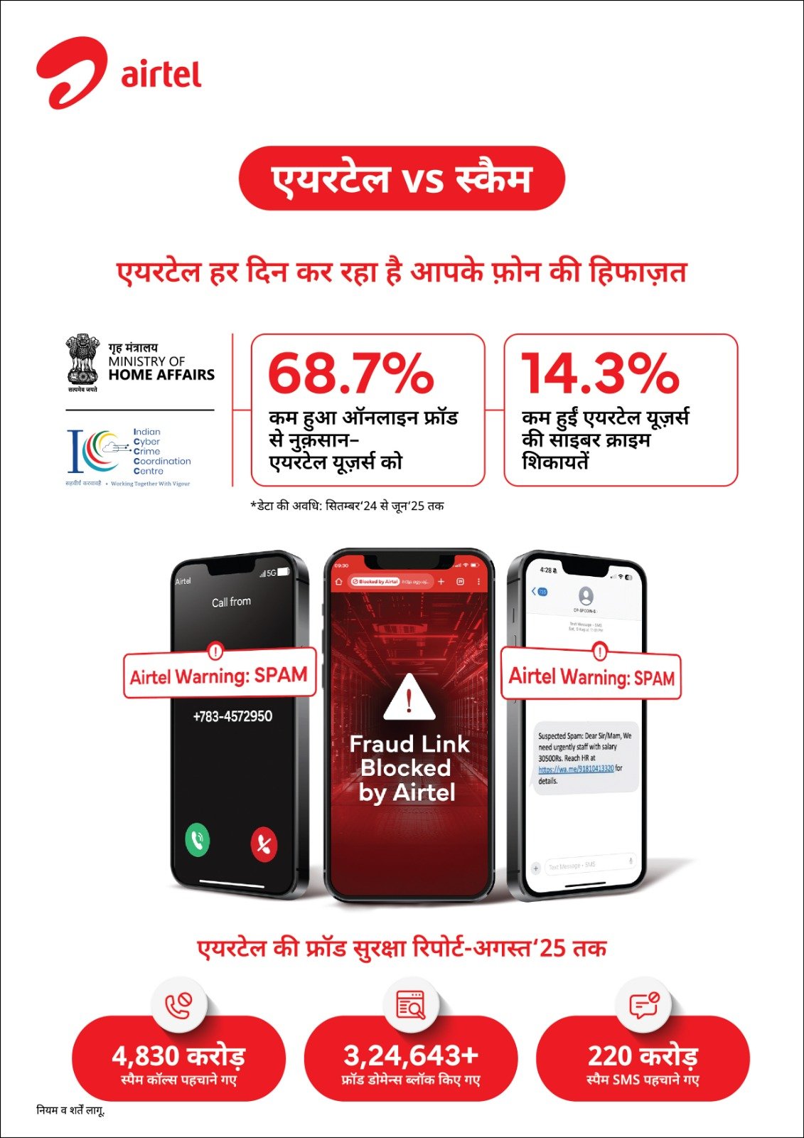 एयरटेल की धोखाधड़ी विरोधी मुहिम से ग्राहकों को होनेवाले वित्तीय नुकसान में आई लगभग 70 फीसदी की कमी