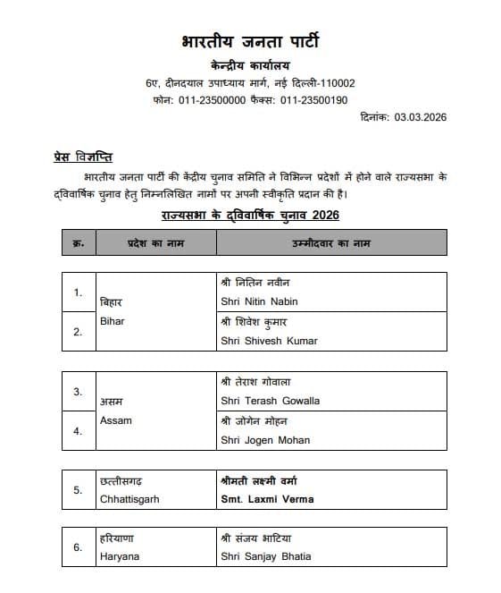 राज्यसभा के लिए भाजपा उम्मीदवारों की घोषणा : छत्तीसगढ़ से लक्ष्मी वर्मा को बनाया प्रत्याशी