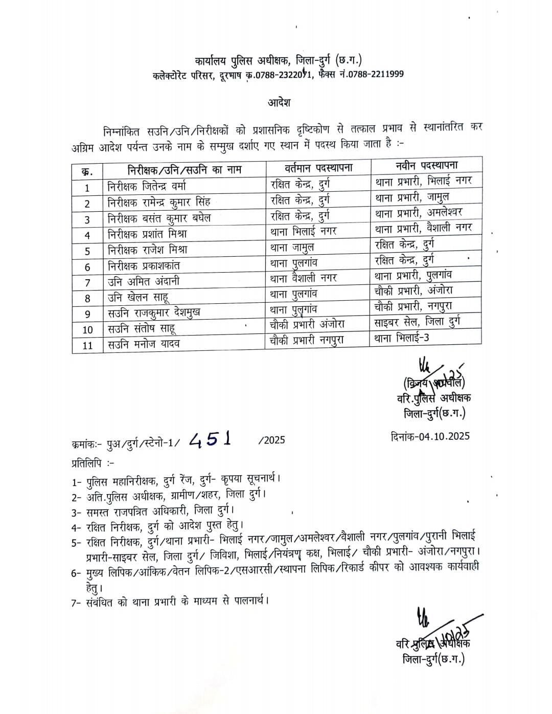 CG Police Transfer Breaking : एसएसपी ने जारी की 11 निरीक्षकों और उपनिरीक्षकों की तबादला सूची