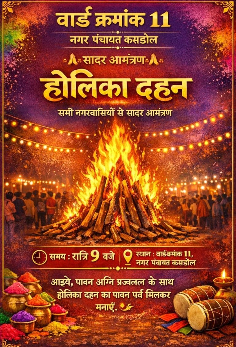 इस प्रकार नगर पंचायत कसडोल के वार्ड क्रमांक 11 में सम्पन्न होगा होलिका दहन कार्यक्रम न केवल धार्मिक आस्था का प्रतीक बना, बल्कि सामाजिक एकता और सामुदायिक सद्भाव का भी प्रेरक उदाहरण प्रस्तुत हैं